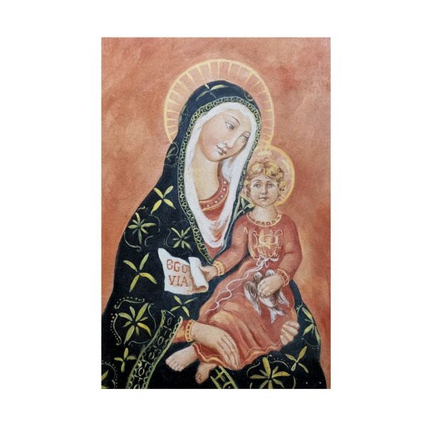 L’affresco Madonna con Bambino 40×60 cm è una tela che rappresenta la Madonna avvolta da una veste nera, mentre regge dolcemente Gesù Bambino fra le braccia, quest’ultimo avvolto da una veste rossa. Entrambi hanno il capo illuminato da una grande aureola dorata e si trovano su uno sfondo rosso.