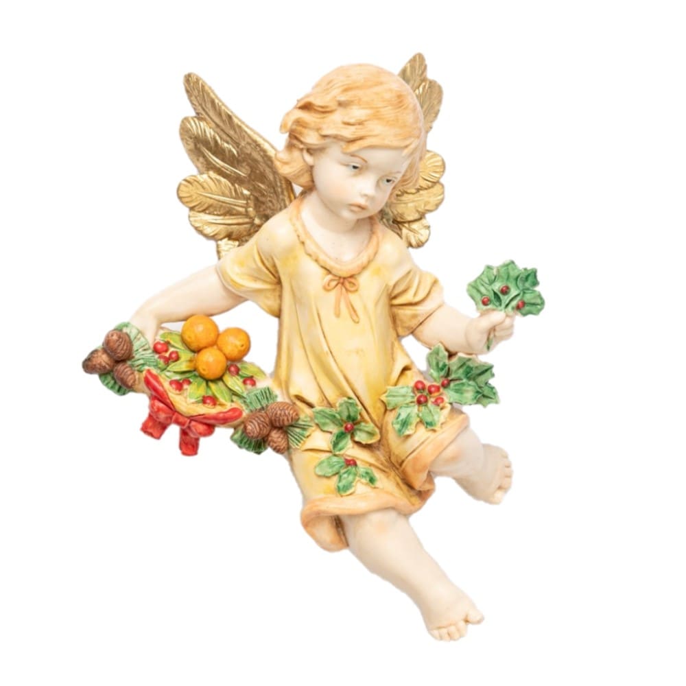 L’Angelo Inverno in polietilene cm 17 e’la raffigurazione di un angelo in volo che porta un cesto di frutta invernale ed un ramo di agrifoglio.