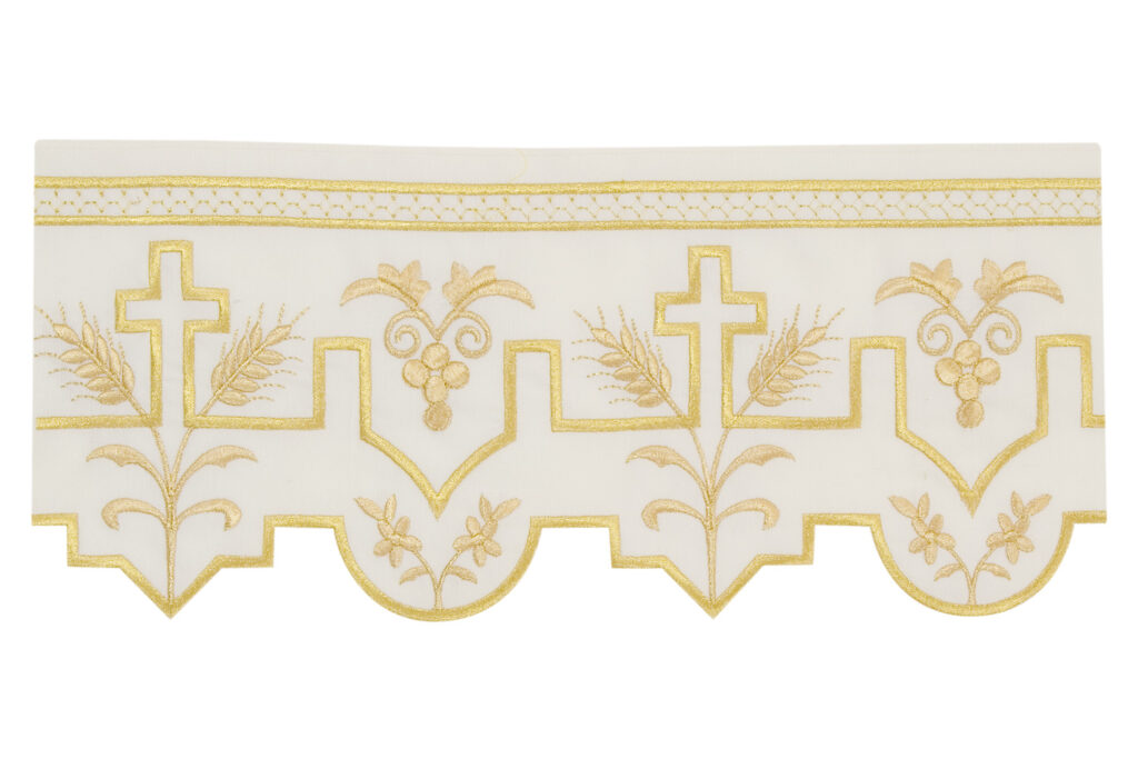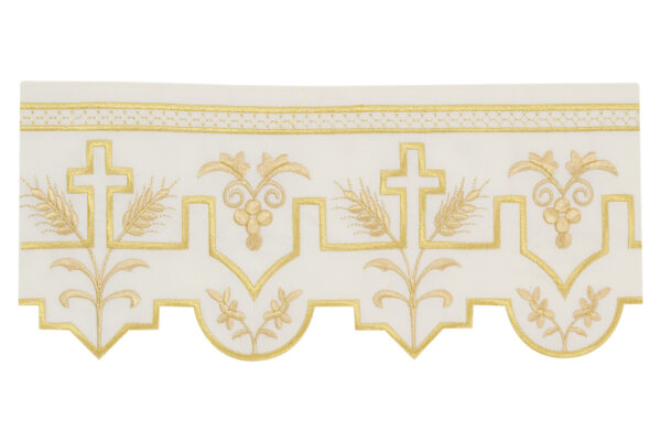 Il bordo raso bianco con spighe e uva color oro è un bordo per altare con dei ricami dorati realizzati a macchina, che rappresentano delle spighe e dell’uva su uno sfondo bianco.