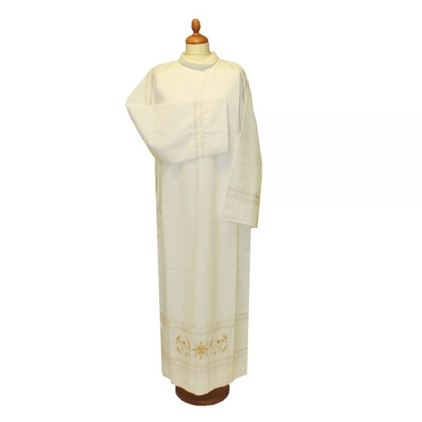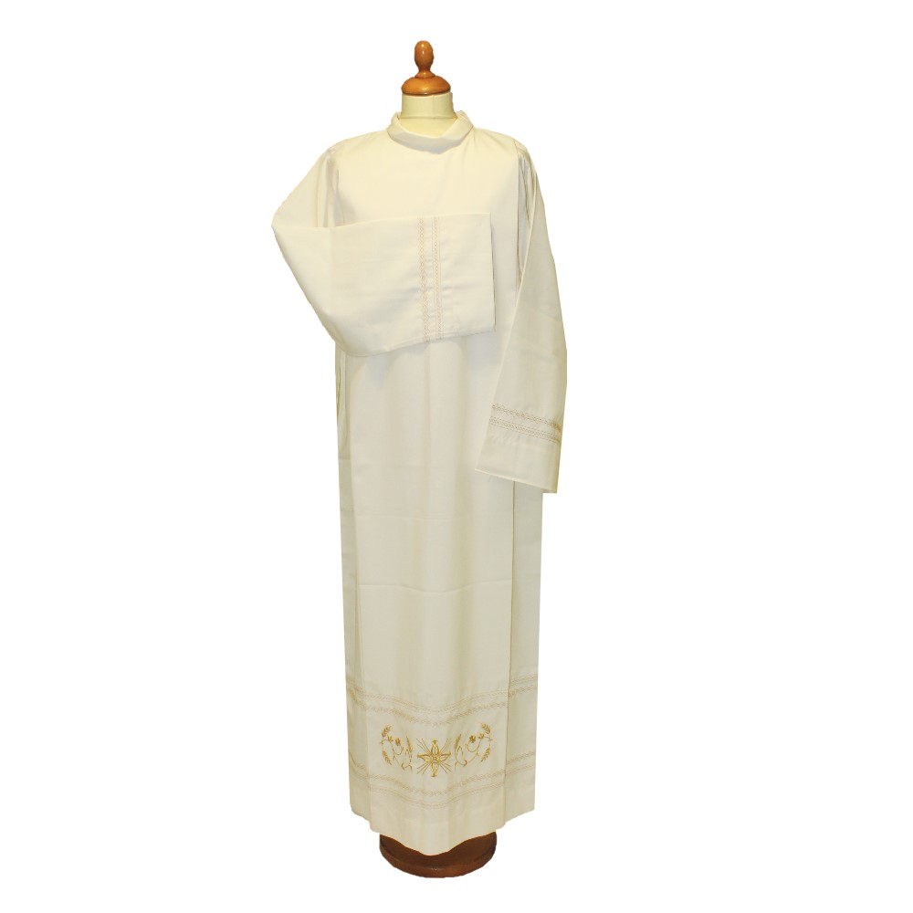 Il camice in lana con decoro cm 160 è un camice con una decorazione dorata sul fondo e sulle maniche. Realizzato in lana. Cerniera sulla spalla destra. Misura cm 160