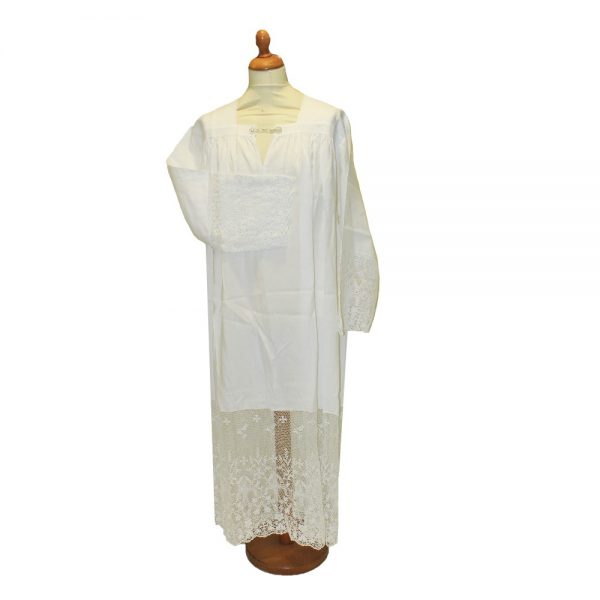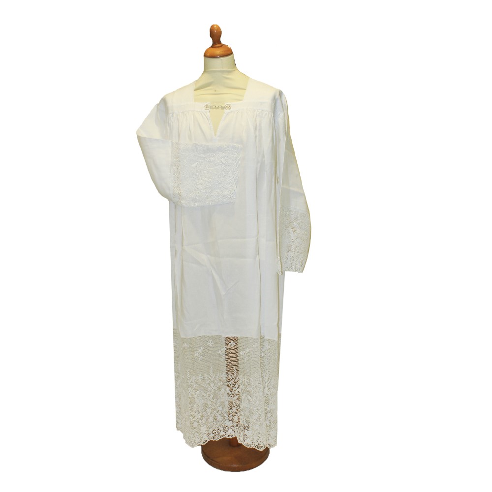 Il camice misto lino e macrame’ cm 140 è un camice realizzato in lana e macramè con delle delicate decorazioni.
