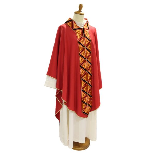 La casula rossa con punta a lancia è un modello a lancia molto innovativo, pur legato alla tradizione secolare dell’abbigliamento liturgico. Lo stolone si sdoppia e arricchisce il collo, definendolo elegantemente. Il manto è in pura lana. Si tratta di un articolo realizzato in Italia, risultato del grande lavoro di esperienza e abilità tecnica, affinata negli anni. Inoltre, l’articolo viene corredato da una stola.