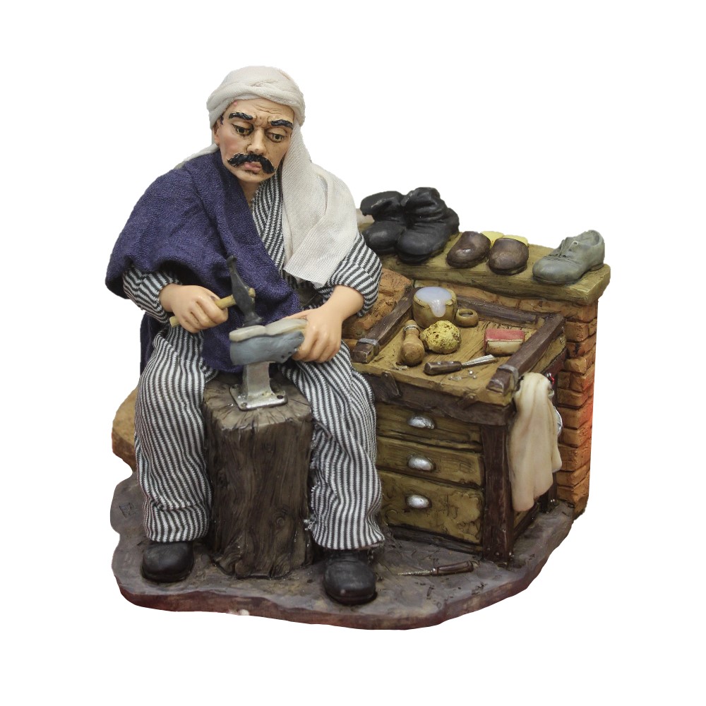 Il ciabattino stile arabo con movimento è una statua da presepe in resina con abiti in stoffa. Grazie al sistema elettrificato, il ciabattino batte con il martello sul tacco della scarpa