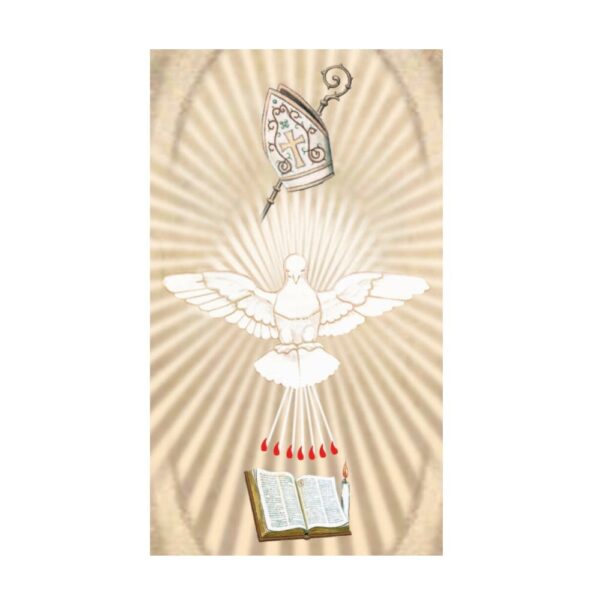 La confezione 100 immagini 7×12 cm di Santa Cresima è un insieme di immagini che rappresentano al centro, una grande colomba bianca al centro, simbolo dello Spirito Santo; mentre in alto si trova una mitria bianca e dorata, dato che la confermazione avviene da parte di un vescovo o di un suo delegato.
