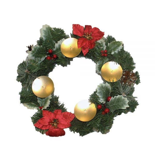La corona per l’avvento con pigne e stelle di Natale ed agrifoglio. Predisposta per i ceri (venduti separatemente). Misura diametro 38.