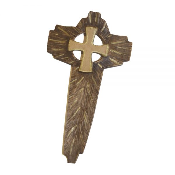 La croce in legno scolpito 16×9 cm è una croce realizzata in legno scuro, con al centro un’altra croce più piccola in legno chiaro.