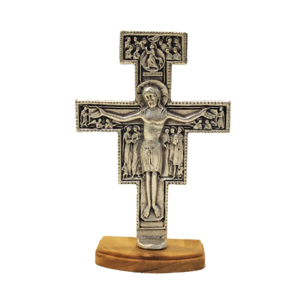 La croce San Damiano con base è rappresentazione della croce di San Damiano, con Gesù Cristo e la croce realizzati in argento, mentre quest’ultima è poggiata su una base in legno.
