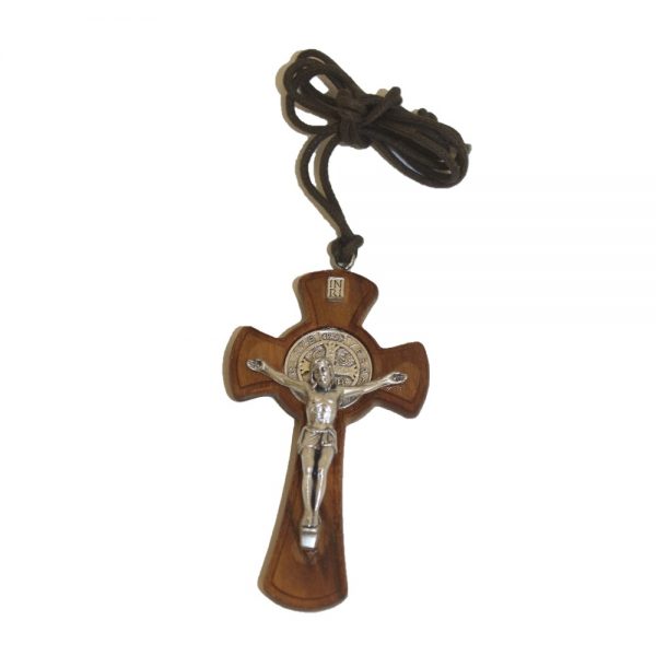 La croce San Benedetto piccola rappresenta la croce di San Benedetto, dotata di un laccio in cuoio.
