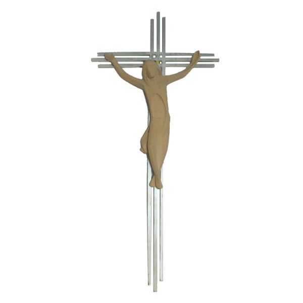 Il Crocefisso croce in acciaio e corpo in legno naturale rappresenta Gesù crocifisso su una croce moderna realizzata in acciaio. Gesù è realizzato in legno chiaro, con linee moderne.