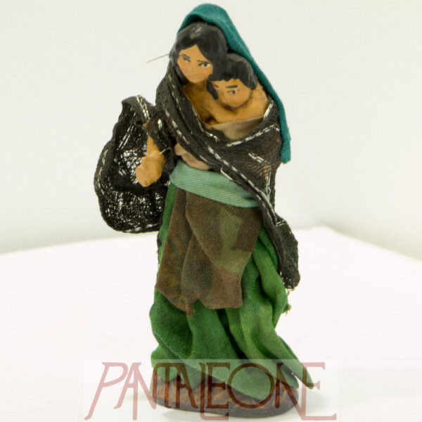 “Donna con bambino” Pastore napoletano in terracotta cm 8. Realizzato da artigiani napoletani. Interamente modellato e dipinto a mano.Si identifica con la Zingara. I suoi abiti sono lunghi, logori e scuri ed il bimbo è avvolto in un panno utilizzato come coperta. Questa figura simboleggia Maria che fugge in Egitto.