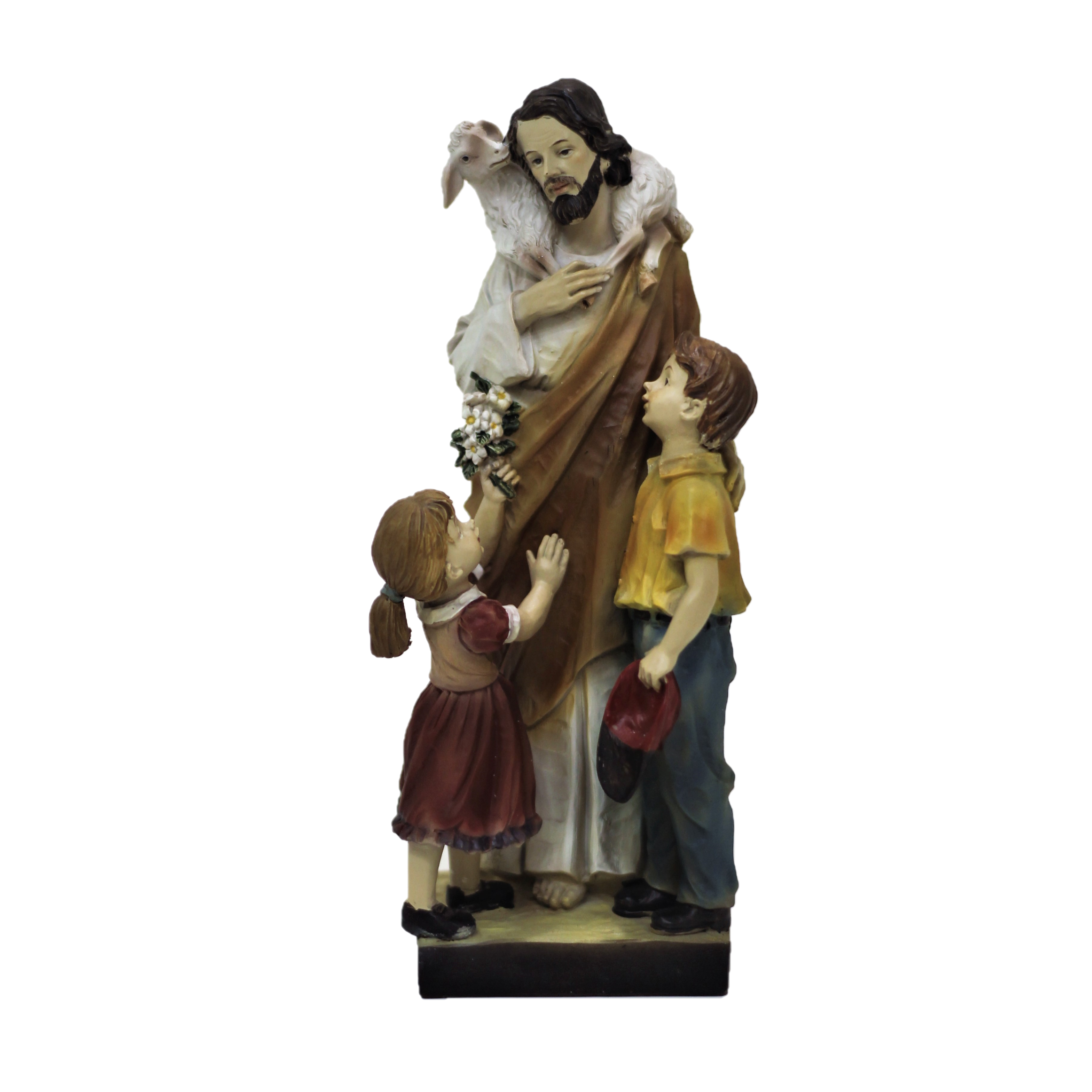 La statua Gesù con i pargoli cm 20 è una statua realizzata in resina dipinta a mano. Gesù è rappresentato con indosso una veste bianca e un velo rosso. Sulla spalla di Gesù si trova una pecorella bianca, mentre acconto a lui si trovano due giovani che lo abbracciano.