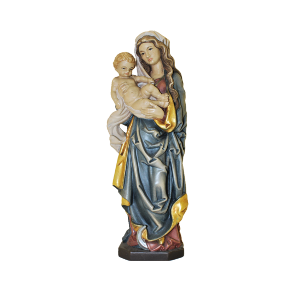 La statua Madonna con Bambino cm 30 è una statua interamente dipinta a mano che rappresenta la Madonna avvolta da una veste rossa e un velo azzurro e dorato, mentre tiene dolcemente in braccio Gesù Bambino.
