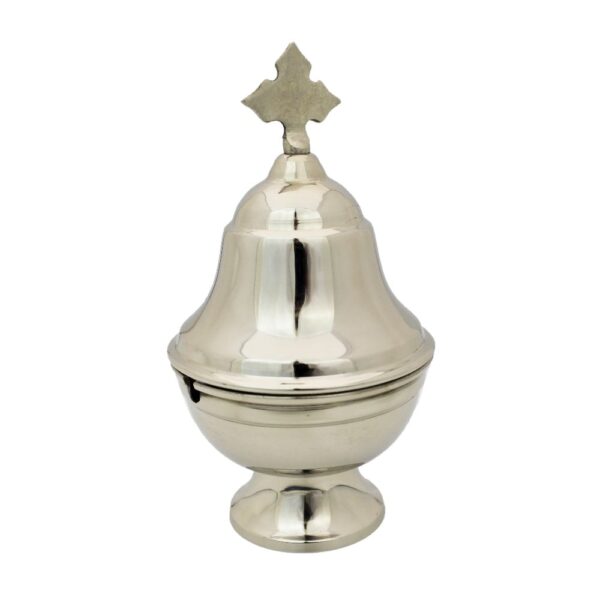 La navetta per turibolo altezza 15 cm è una navetta molto semplice ed elegante realizzata in metallo, con una croce sul coperchio.