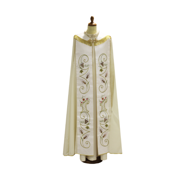 Il piviale liturgico presenta ricamo particolarmente accurato e dettagliato che rappresenta delle spighe nella sua stola in raso.