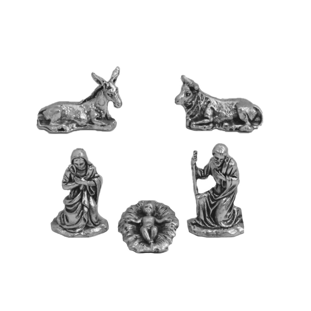 Il presepe componibile in metallo cm 3 è una composizione di 5 pezzi formata da Madonna, San Giuseppe, Bambino in culla, asino e bue realizzati in peltro