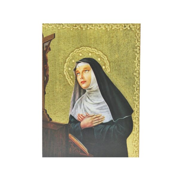 Il quadretto immagine Santa Rita è un quadro che rappresenta il dolce volto della Santa inginocchiata davanti al crocifisso. La tavola presenta uno sfondo dorato.