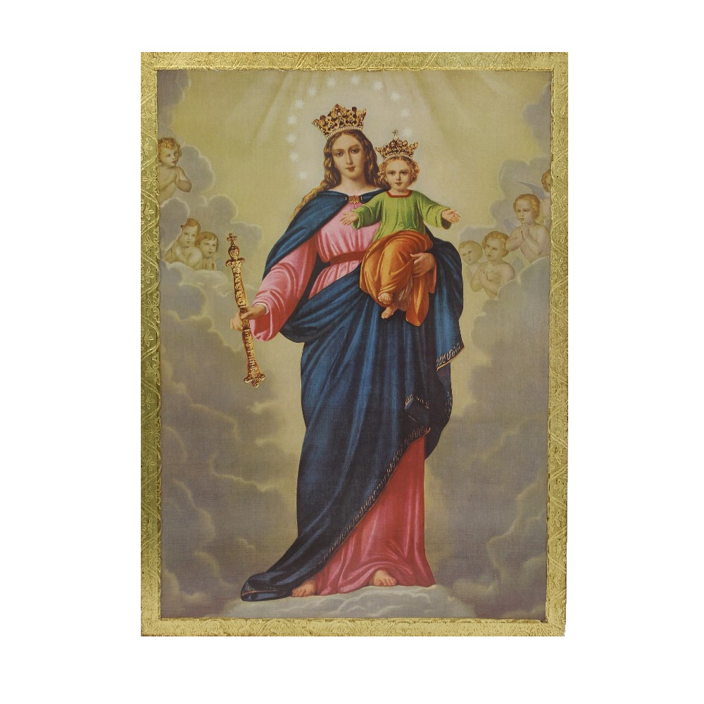 Il quadro Maria Ausiliatrice 27×37 cm è un quadro che rappresenta la Madonna mentre regge dolcemente Gesù Bambino fra le braccia. Entrambi portano una grande corona dorata sul capo e alle loro spalle si trovano delle nuvole bianche e i volti di tanti piccoli angeli.