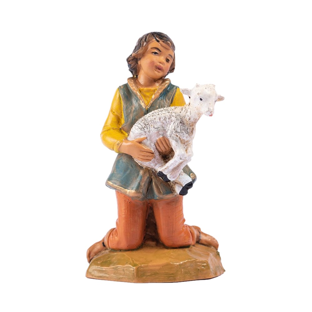 Il ragazzo in ginocchio con capretta cm 12 Fontanini è una statua per presepe in polietilene che rappresenta un ragazzo con una maglia gialla, dei pantaloni marroni e un gilet azzurro, mentre regge una capretta bianca fra le braccia.