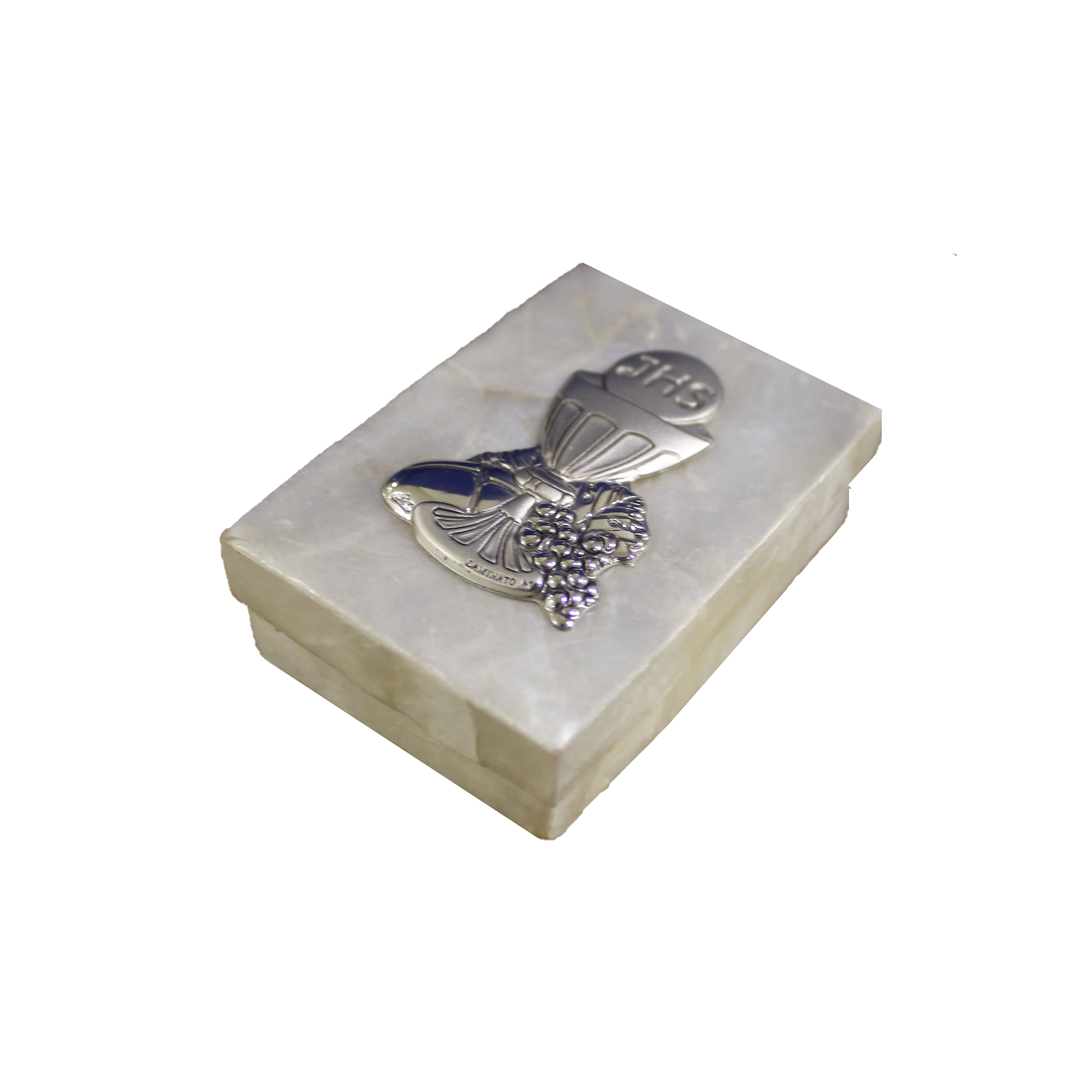 La scatola madreperla con palchetta argento è una scatola in madreperla con una placca argentata che rappresenta il calice, l’uva e un’ostia.