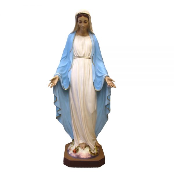 La Statua Madonna Miracolosa cm 150 in vetroresina rappresenta la Madonna Miracolosa con le braccia tese, come se stesse accogliendo il fedele. Una morbida veste bianca e un mantello azzurro dai bordi dorati la avvolgono dolcemente. I piedi, scalzi, poggiano su una piccola base.