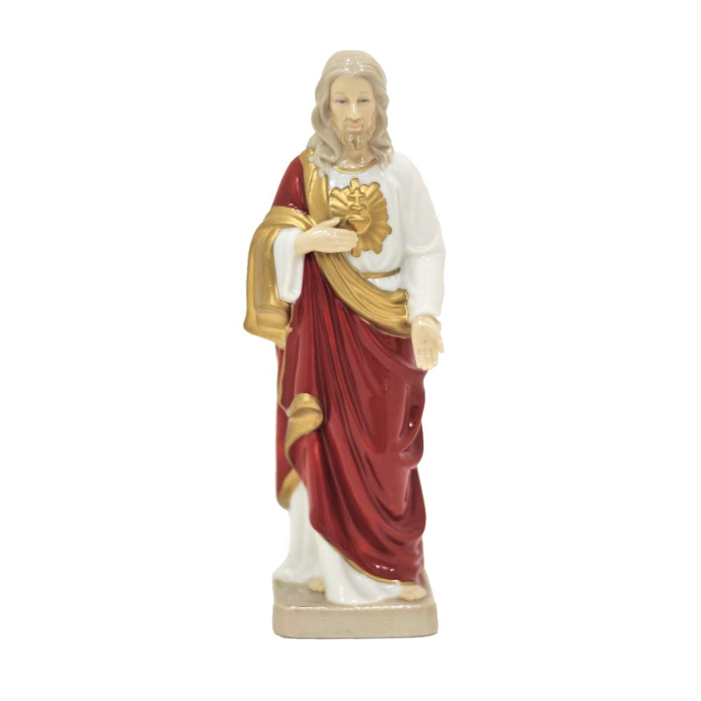 La statua Sacro Cuore di Gesù in porcellana cm 23, rappresenta la figura di Gesù avvolto da una morbida veste bianca e rossa, mentre porta una mano al petto.